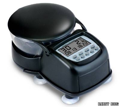 Кормушка,особенно, в аквариуме с зарослями также может оказаться полезнее, нежели в водоеме, где основное внимание уделяется рыбам. Поскольку для подводных садов подбирают преимущественно спокойных и близких по размеру рыб, то особой конкуренции в питании друг другу они не создают. По этой причине кормушка, плавающая на поверхности воды, может быть полезна: она приучает рыб собирать еду в одном месте. Если в кормушку насыпают искусственный корм, который легче воды, то он не будет расплываться по всей поверхности. Если через кормушку с сетчатым дном скармливают трубочник, то, постепенно пробиваясь сквозь толщу воды, он станет добычей тех видов, которые берут пищу со дна неохотно - среди них много мелких, ярко окрашенных харацинообразных рыбок - желанных обитателей декоративных аквариумов.Ну фото обычной кормушки я выкладывать не буду,а вот на автоматические посмотреть можно.В основном они предназначены для сухого корма,в них находится таймер,который в заданное время включает кормушку -она крутится и корм через специальное отверстие высыпается в аквариум,в них обычно можно регулировать количество высыпаемого корма и количество срабатываний в день.