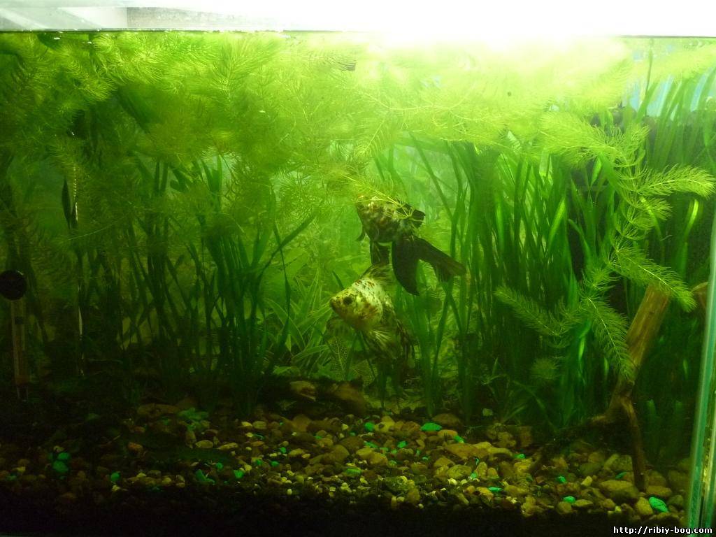 Третий аквариум (самый проблемный в плане водорослей) 160 литров, 90х40х45, фильтр Фан2, грелки нет, грунт фракция 3-6мм слой 6-7см, свет (общий на 80 литров) 200 Вт горит 12-14 часов (пока я на работе, нет у меня таймера, в выходные меньше - 8-10 часов). Трава - валиснерия и лимнофила растут; криптокарина, бликса и один эхинодорус "сидят"; нимфея, анубиас, и два других эхинодоруса медленно загибаются; роголистник конечно в немеряных кол-вах Население - 7 барбусов (5 суматранцев и 2 мшистых), 3 скалярии, 1 анциструс, 1 лабео биколор, 1 лялиус и 7-10 (сколько точно не знаю) самок гуппи (недавно разглядела одного самца, подрос видать с малька), 3 ампулярии