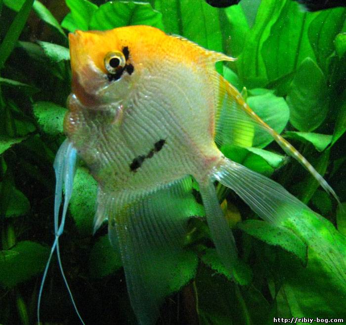 Для общего развития подкину инфу Скалярия, называющаяся также рыбкой-листом или полумесяцем, является одним из оригинальнейших представителей тропических рыб в наших аквариумах и наиболее популярным из цихлид. В природных условиях живет в реке Амазонке и ее притоках. Скалярия замечательна по раскраске и своеобразна по форме, которая послужила поводом к самым разнообразным ее наименованиям, таких, как ласточка, бабочка, полумесяц и рыбка-лист. Плоское, дисковидное тело скалярии с большими удлиненными плавниками действительно напоминает очертания какого-то оригинального листа. С формами рыбки хорошо гармонирует ее манера спокойно и важно плавать, грациозность ее движений, что придает скалярии особую декоративную ценность. Раскраска рыбки составляет строгий узор. По серебристой блестящей чешуе, по каждой стороне ее тела сверху вниз идут бархатно-черные поперечные полосы, которые могут бледнеть до почти незаметных в зависимости от температуры воды, настроения рыбки и освещения. Первая поперечная полоса идет от начала спинного плавника через голову, глаза, жаберные крышки и заканчивается у брюшных нитеобразных плавников. Вторая идет от коротких лучей спинного плавника по всему корпусу до анального отверстия. Третья, наиболее широкая, проходит через все тело, спинной и анальный плавники, дает почти перпендикулярные ответвления в задней части плавников. Четвертая как бы проводит границу между телом рыбки и лучами хвостового плавника. Кроме этих, ясно выраженных четырех поперечных полос, у молодежи отчетливо проявляются три узкие полоски, которые, однако, редко сохраняются у взрослых рыбок. Одна из них идет вниз от начала коротких лучей спинного плавника, вторая проходит между третьей и второй широкими поперечными полосами, сливаясь с третьей в спинном плавнике (сохраняется в спинной части корпуса у большинства взрослых рыбок, а у некоторых сохраняется полностью), и, наконец, третья как бы отделяет собой корпус рыбки от хвостового отростка. Аквариум, где живут скалярии, должен содержаться в чистоте, а испортившаяся и помутневшая вода должна регулярно подмениваться. Достаточно подменить одну треть воды свежей, чтобы заметить приподнятое настроение у рыбок, которые сразу предстают в своем самом лучшем наряде. Когда несколько складывая плавники, они принимают форму полураскрытого веера или вдруг расправляют их, как птицы, готовящиеся к полету, рыбки бывают очень хороши. В литературе и среди любителей, особенно малоопытных, распространено ошибочное мнение о том, что скалярий нужно содержать в особо больших аквариумах (до 24 ведер) при высокой температуре воды (30 - 32') и обязательно отдельно от других рыб; их считают хищными, очень драчливых и с неуживчивыми. Эти опасения преувеличены и не подтверждаются опытом московских любителей. Например, хотя известно, что большинство аквариумных рыб склонно поедать свое потомство и мальков других рыб, однако в практике содержания скалярий в общем аквариуме наблюдались случаи, когда они не поедали появлявшихся мальков живородящих рыб (моллиенезий) и пущенных специально в аквариум мальков других рыб (данио рерио). Сытая скалярия, не приученная к кормлению мальками, не только не трогает других взрослых рыб, но и не преследует их мальков. Это, разумеется, не значит, что следует рекоменд