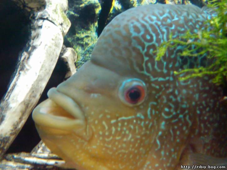 Фловер Хорн 1,5 года, живет один в 250 литров. Компрессор Aquael fun-3 plus. Кушает через день говяжье сердце. Последние несколько дней сидит за мангровой корягой и не реагирует особо не на кого, есть почти не хочет, по чуть-чуть кушает и похудел, принял более темный пигмент. И беспокоят его глаза один здоровый красного цвета а другой потемнел и внутри глаза какие-то волокна красные. ниже фотка. что нам с ним делать?? А сегодня совсем отказался от еды(((помогите...